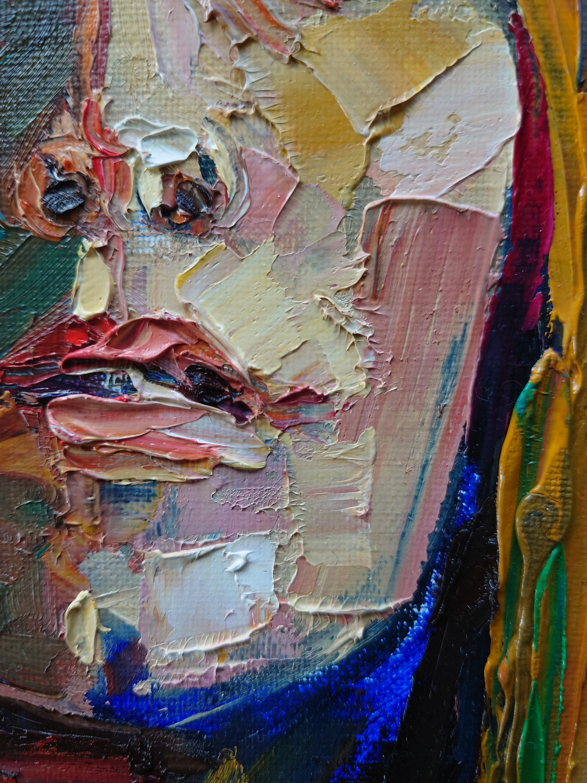 "Echo of Hope" is a compelling portrait defined by its rhythmic structure and profound serenity. The vertical, straight strands of hair act as a symbolic curtain of light, falling over a face that emerges from a deep, signature turquoise background. These vertical lines create a sense of spiritual order and stability. Using my sculptural impasto technique, I have treated the oil paint as a living material, carving out hope from the shadows. This work is a cornerstone of the "Soul Studies" series, representing the persistent echo of inner light that remains steady even in the vastness of the unknown.