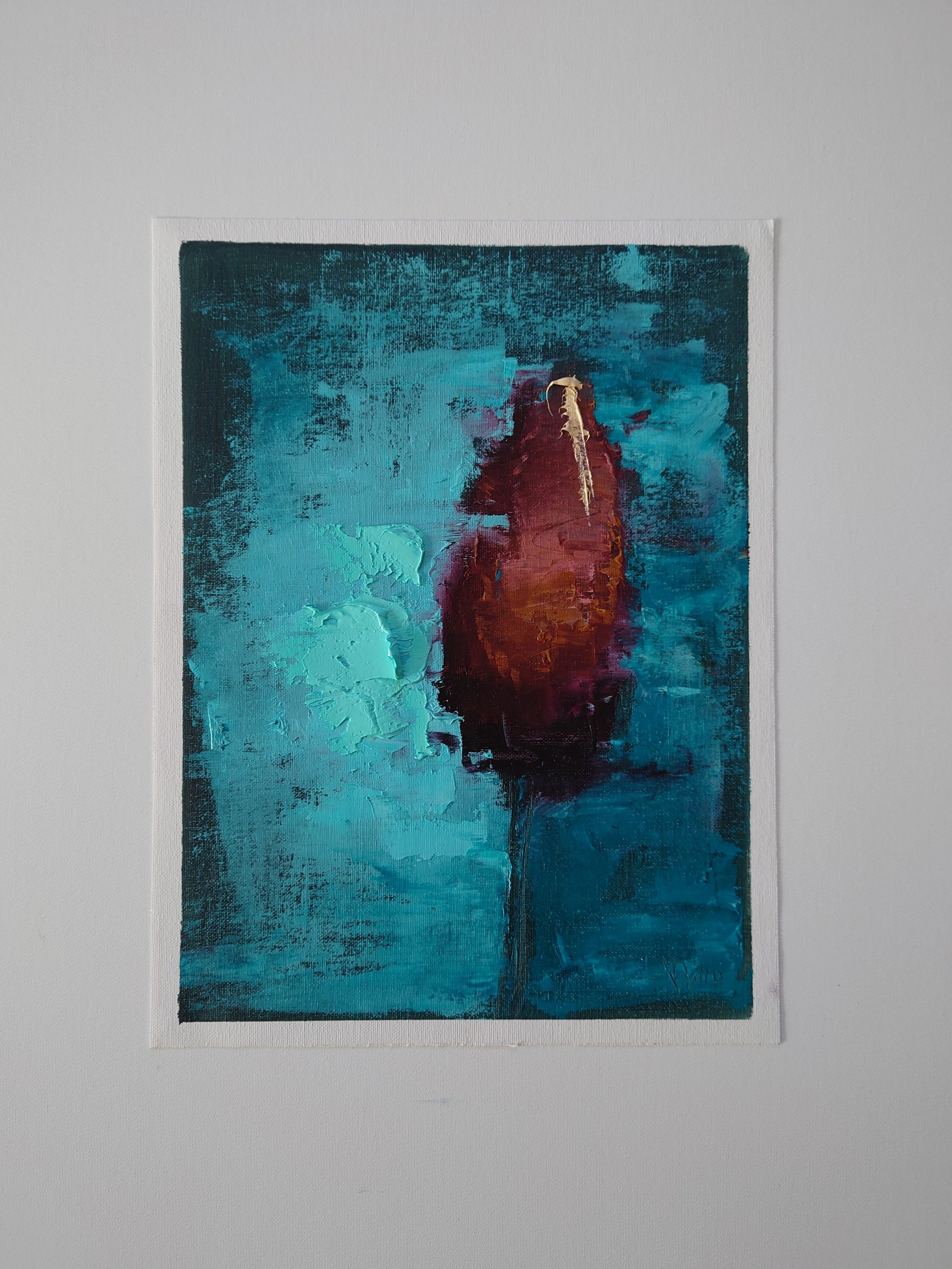 A solitary tulip captured in the visible existence. Against the vibrant turquoise background, the flower becomes a vessel of light, echoing the stillness of my country estate studio. A small, profound meditation on nature’s humble presence. The natural, unpainted edges of the canvas paper are intentionally preserved to reflect the raw, authentic process of my studio.